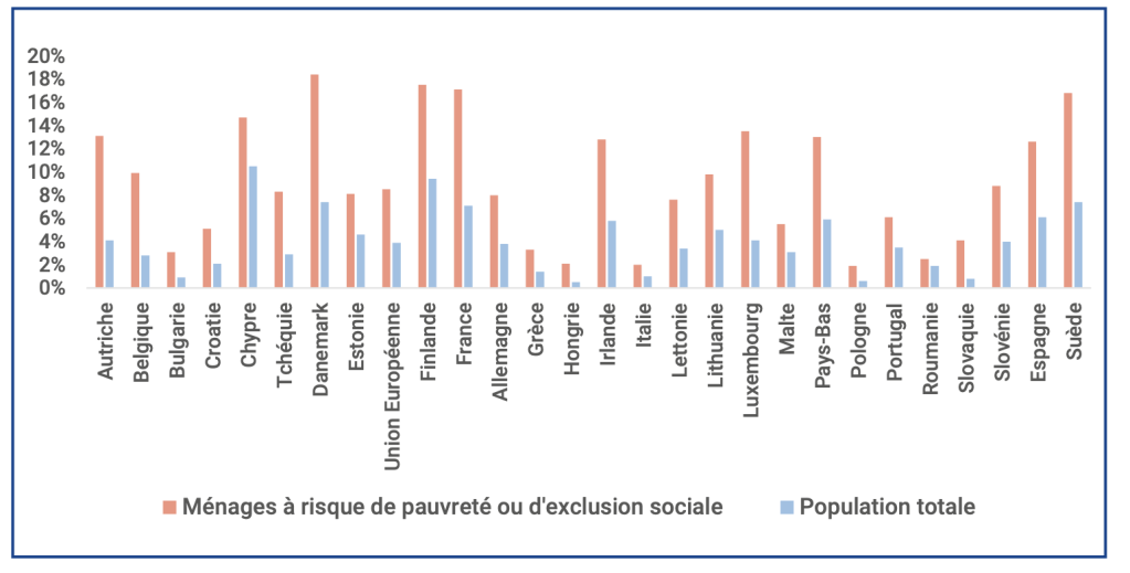 Selon le rapport “10e regard sur le mal-logement en Europe” publié par la Fondation pour le Logement et la Fédération européenne des organisations nationales travaillant avec les sans-abris (FEANTSA), les personnes à risque de pauvreté ou d’exclusion sociale sont plus susceptibles d’avoir une situation de sans-abrisme (environ 8,5%) contre celles qui ne se retrouvent pas dans une situation d’exclusion sociale (3,9%).